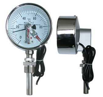 应用 电接点双金属温度计应用于生产现场对温度需自动控制和报警。可以直接测量各种生产过程中的-80℃-+500℃范围内液体、蒸汽和气体介质温度。 主要特点 现场显示温度,直观方便;具有自动切断电源和报警功能;安全可靠,使用寿命长;多种结构形式,如“上下限”、“双上限”、 “双下限”,可满足不同客户要求 。